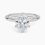 Solitaire engagement ring features a petite 1.8 mm band and an open basket with six claw prongs that cradle the center diamond.