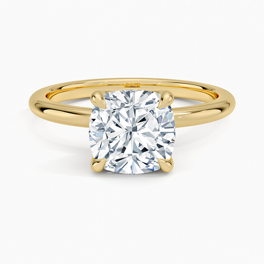 Solitaire engagement ring features a petite 1.8 mm band and an open basket with four claw prongs that cradle the center diamond.